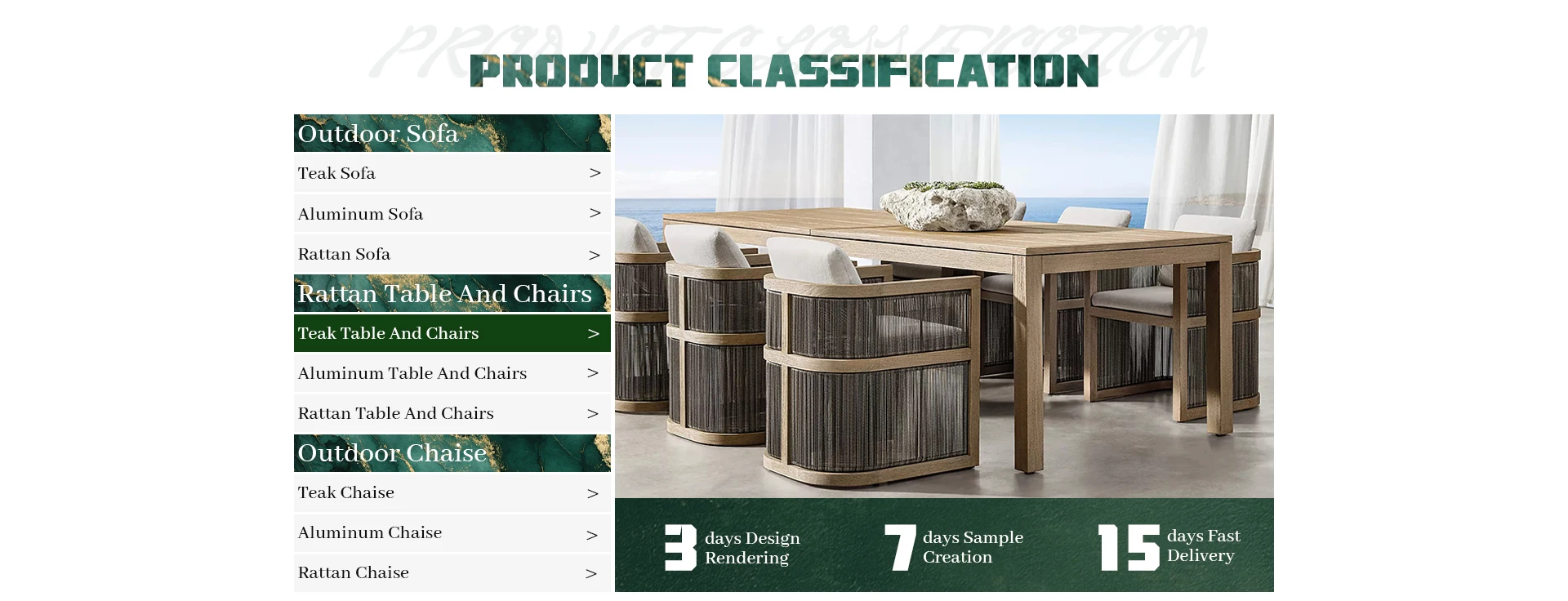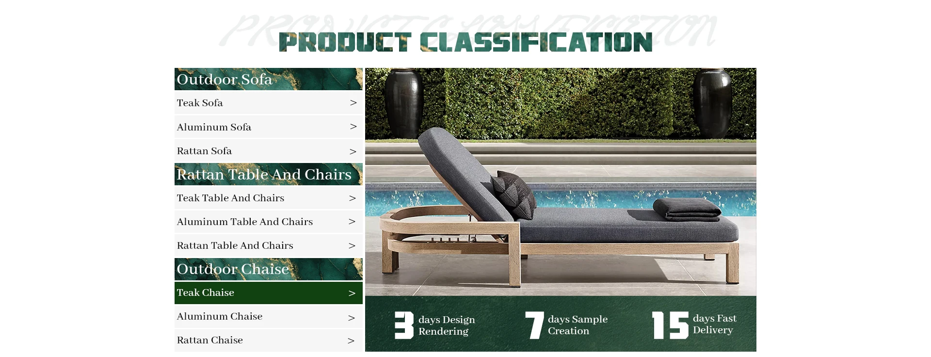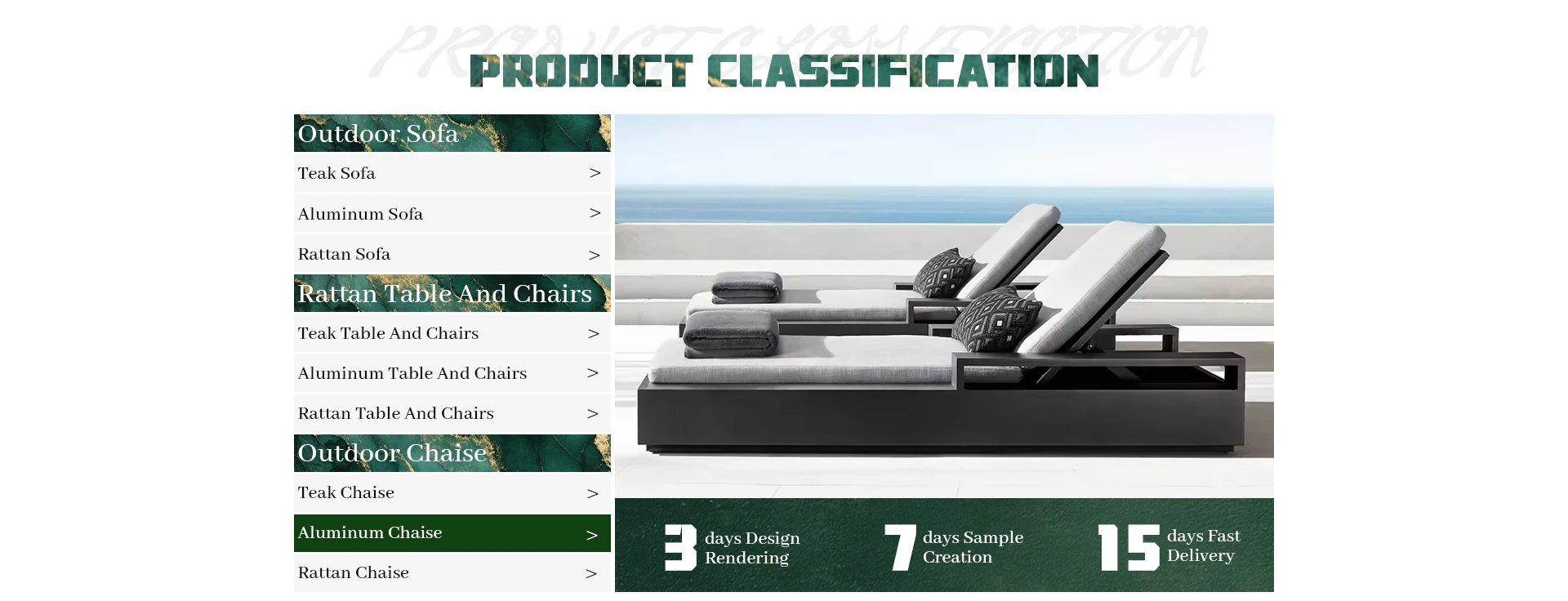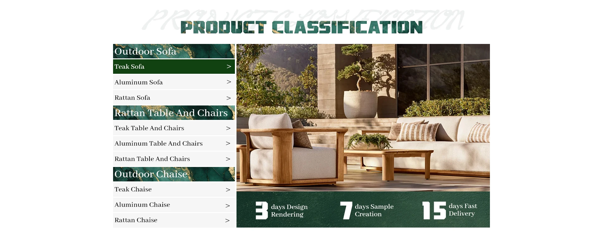 Productos principales:Muebles de teca para exteriores, muebles de aluminio para exteriores, muebles de ratán para exteriores, muebles tapizados para interiores, muebles de madera maciza para interiores