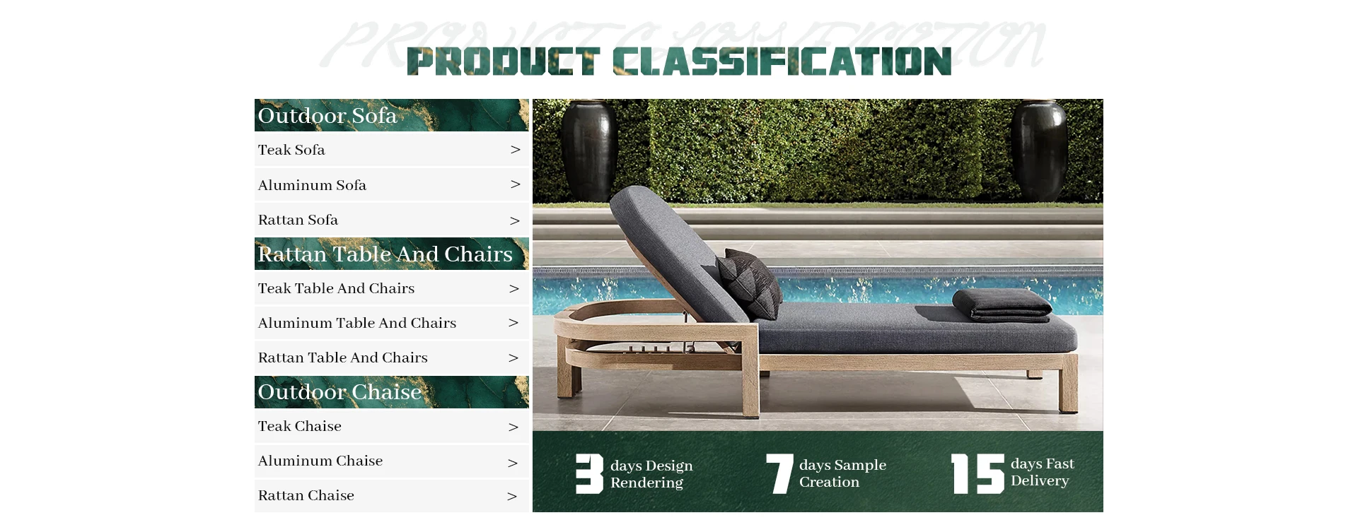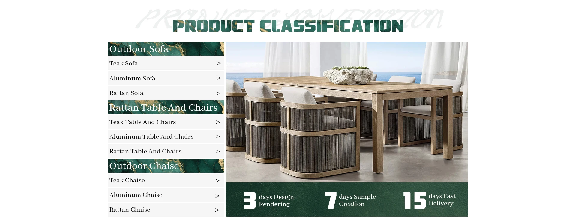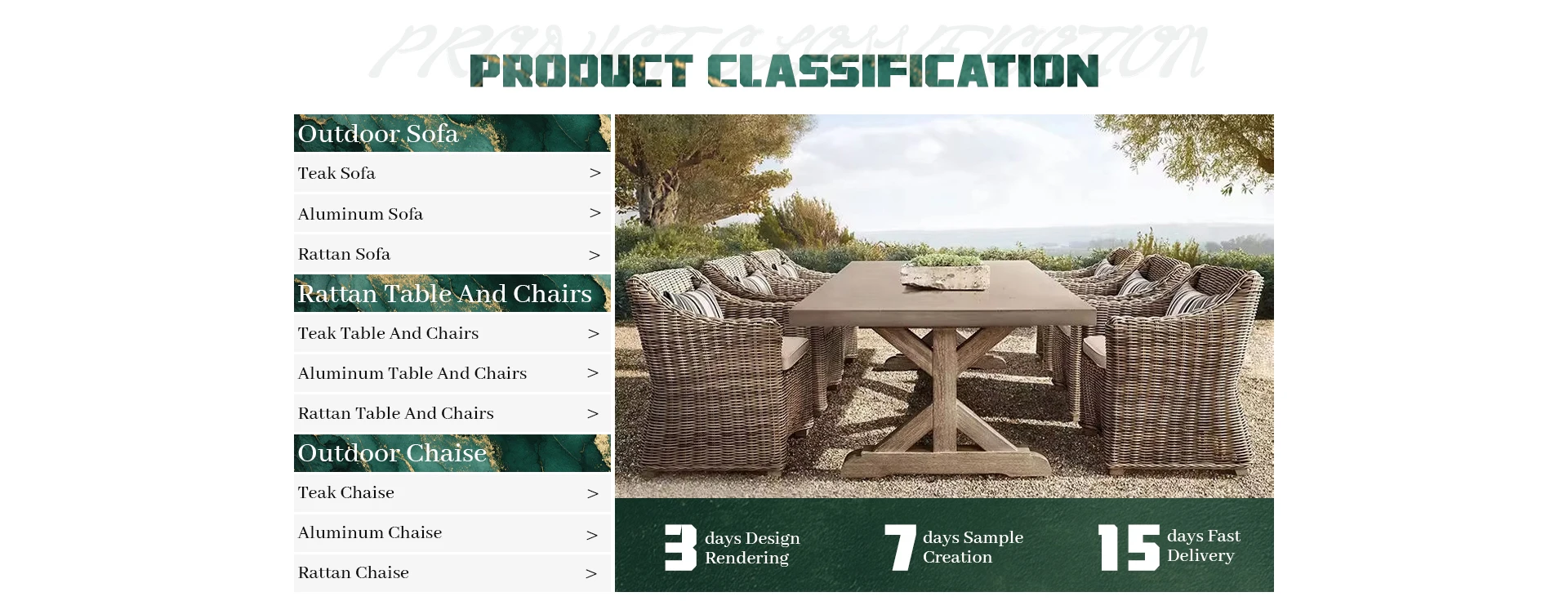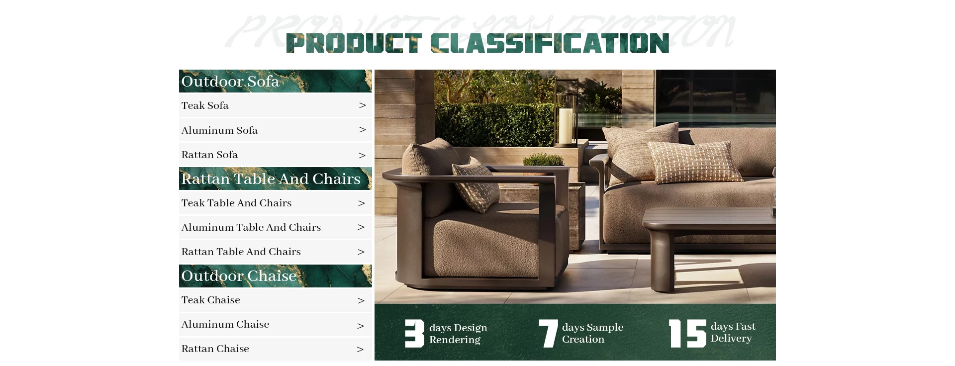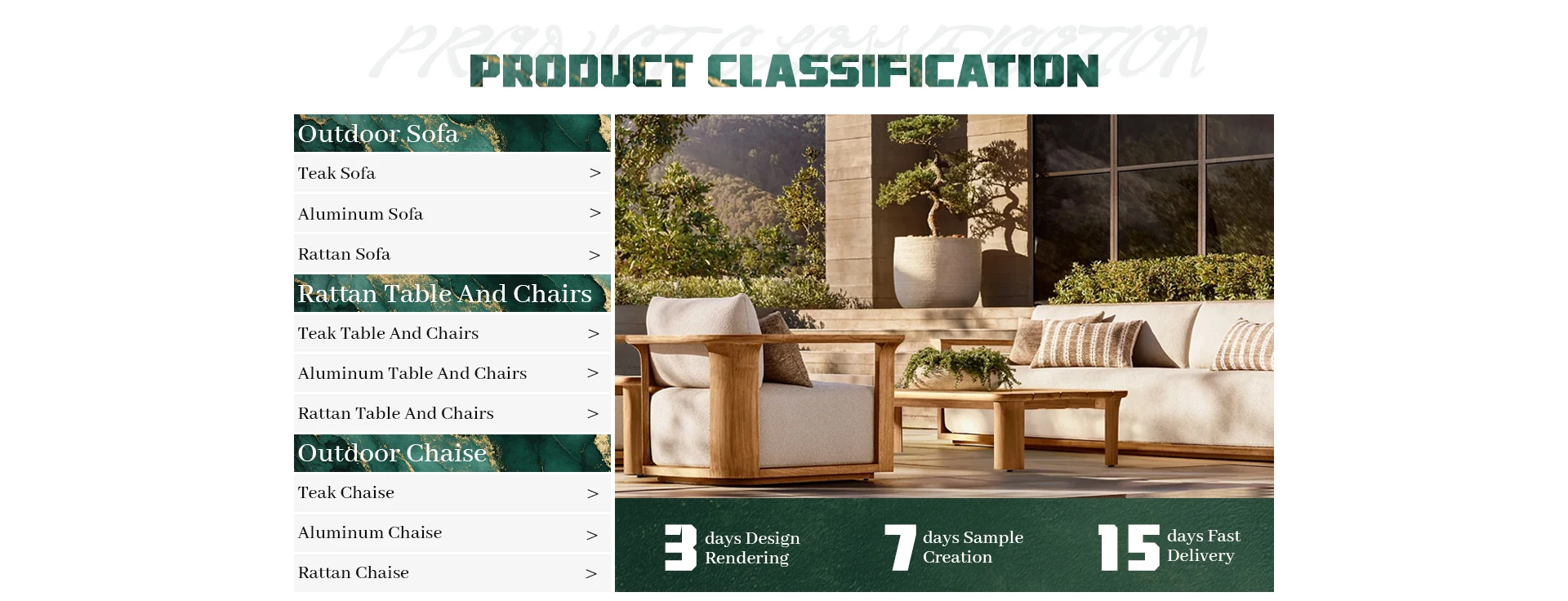 Principais produtos:Móveis de teca ao ar livre, móveis de alumínio ao ar livre, móveis de vime ao ar livre, móveis estofados para interior, móveis de madeira maciça para interior