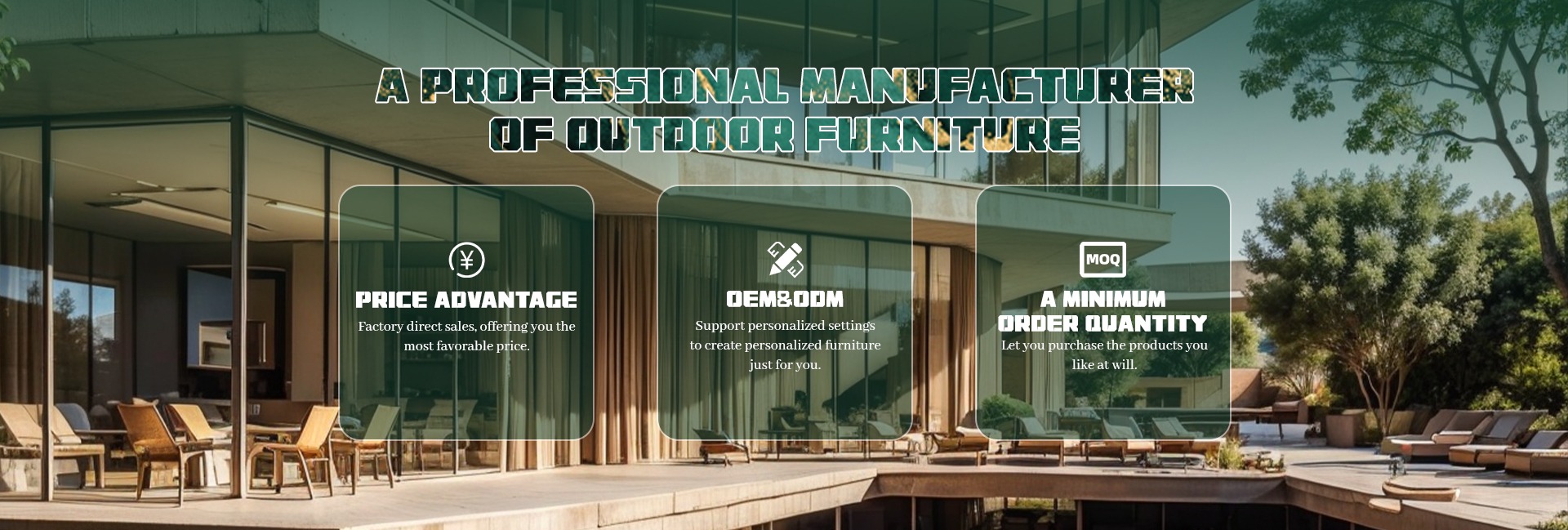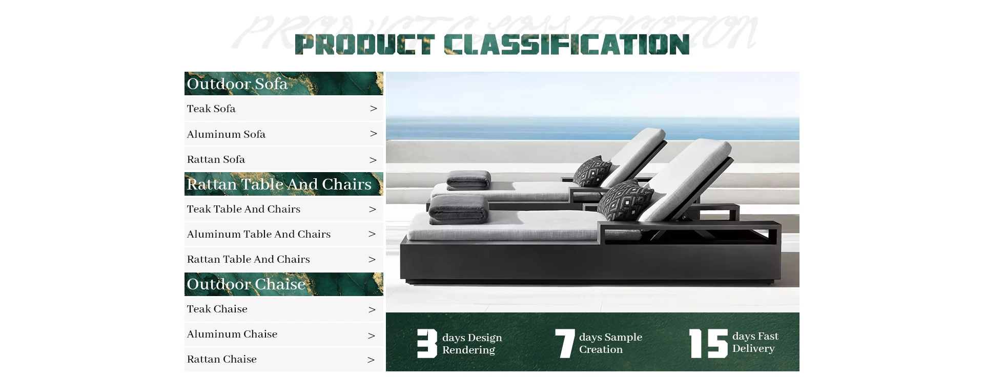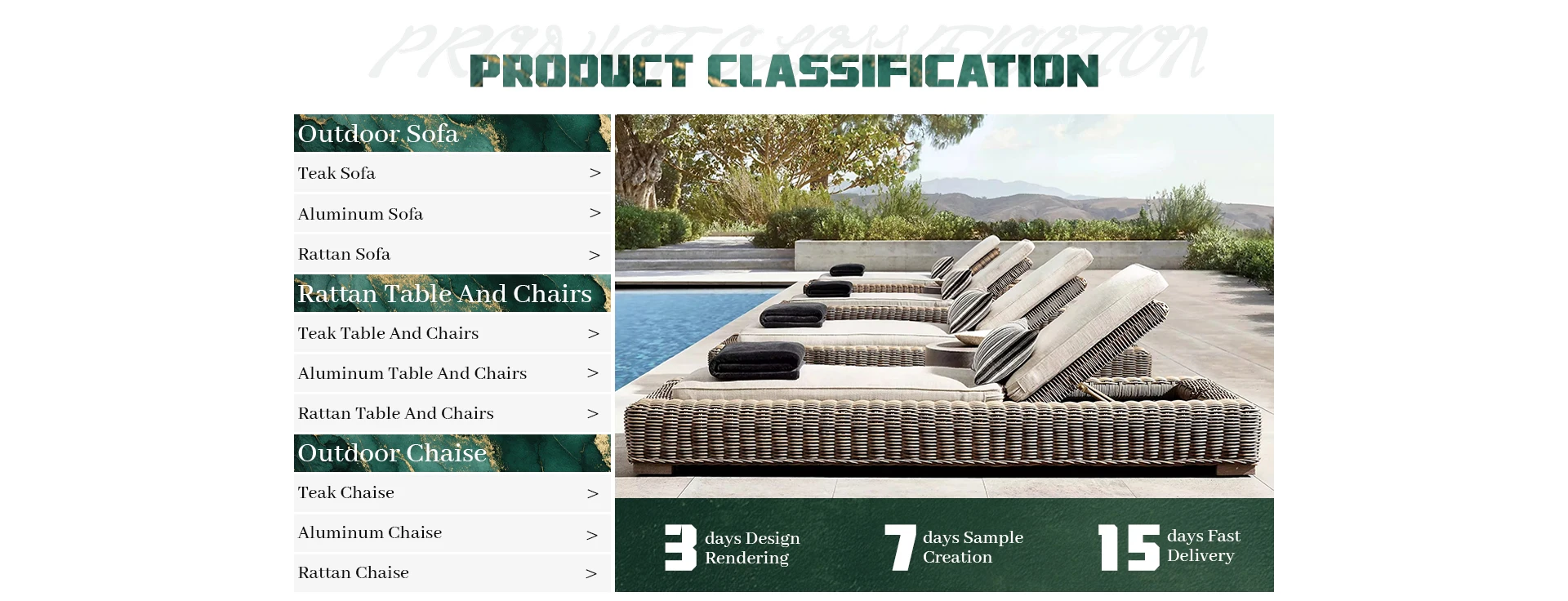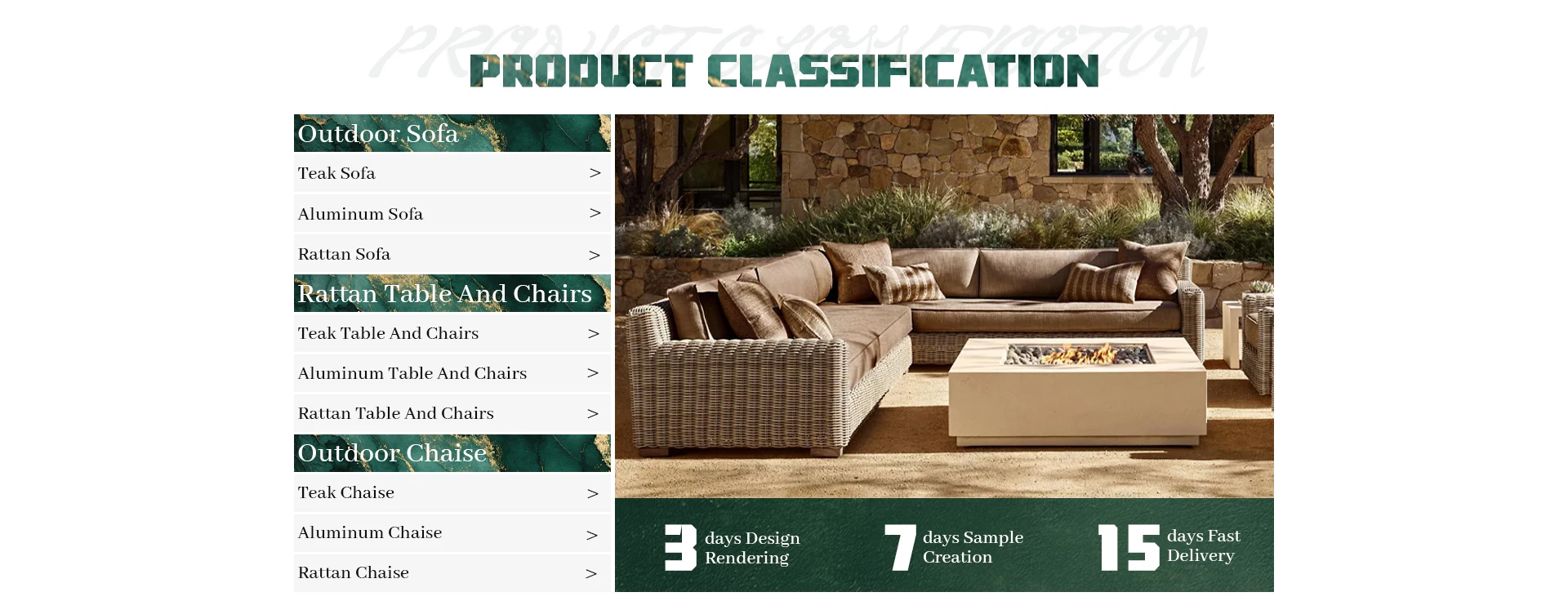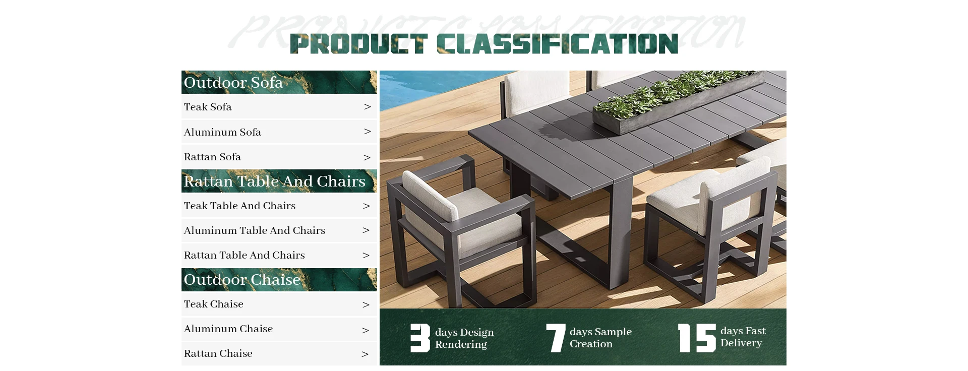 Principais produtos:Móveis de teca ao ar livre, móveis de alumínio ao ar livre, móveis de vime ao ar livre, móveis estofados para interior, móveis de madeira maciça para interior
